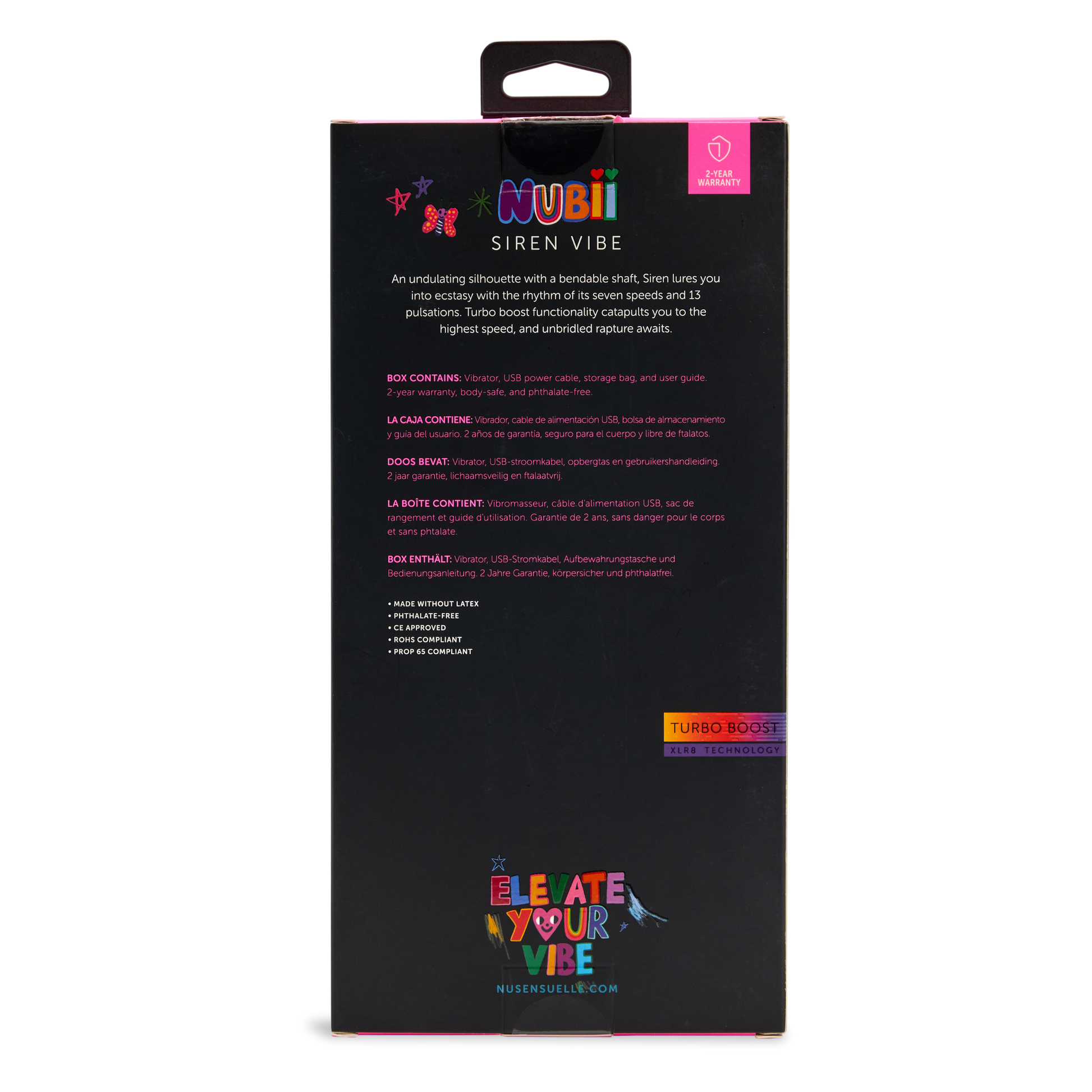 Dive into mouthwatering G-spot stimulation and personal massager with this bendable vibe. With inclusivity and diversity at the forefront of the design process, Nu Sensuelle developed Nubii Siren Vibe with an undulating silhouette and the ability to bend, allowing you to tailor the vibe to your preferences. With seven luscious speeds and 13 titillating pulsations, Siren targets delicious G-spot stimulation. The toy’s expansive vaginal and g-spot vibrators can also arouse the clitoris and other sensory spots. Simply double-click the (-) button to engage the turbo boost functionality, and elevate your experience by catapulting the speed to the highest setting. Like its name-sake, Siren indeed lures you into ecstasy and unbridled rapture.